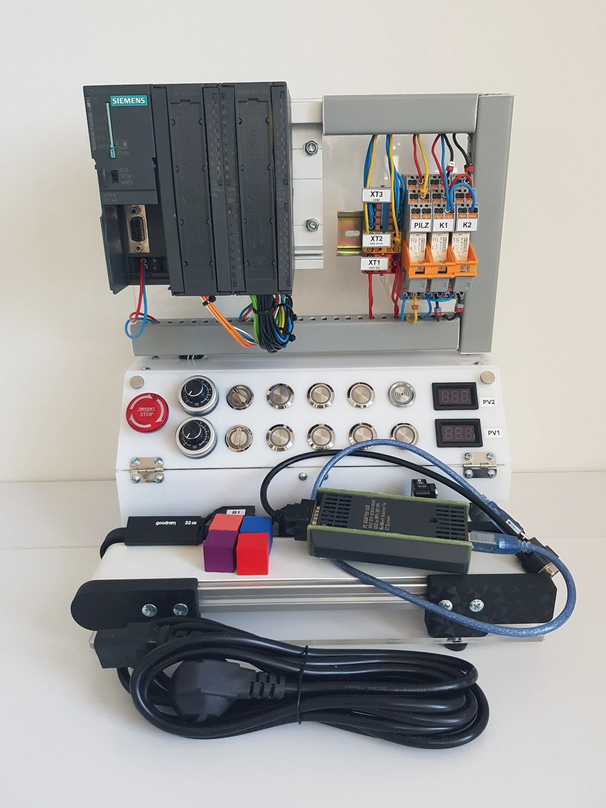 Compact training setup for Siemens S7 300 PLC. Compatible with Siemens TIA Portal And Step 7. Can be used alongside official Siemens PRO-TIA1 , PRO-TIA2, ST-PRO1, ST-PRO2, ST-PRO3 and other Siemens course materials.